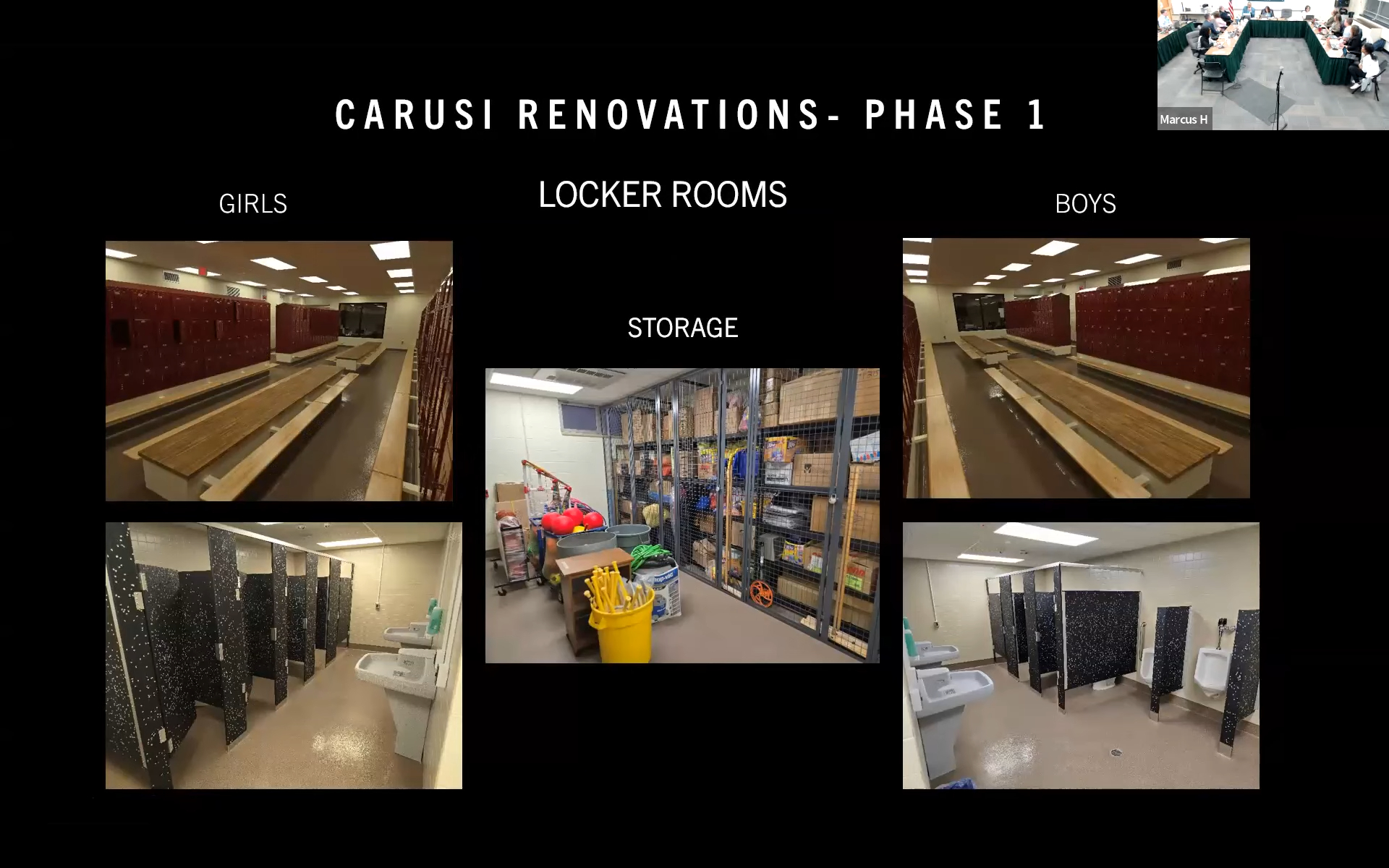 She then highlighted the four-phase upgrades at Carusi Middle School. The district is in the process of wrapping up Phase 1, which includes the renovations of A wing, along with the gym – which will also get insulated panels – locker rooms and the main office area.