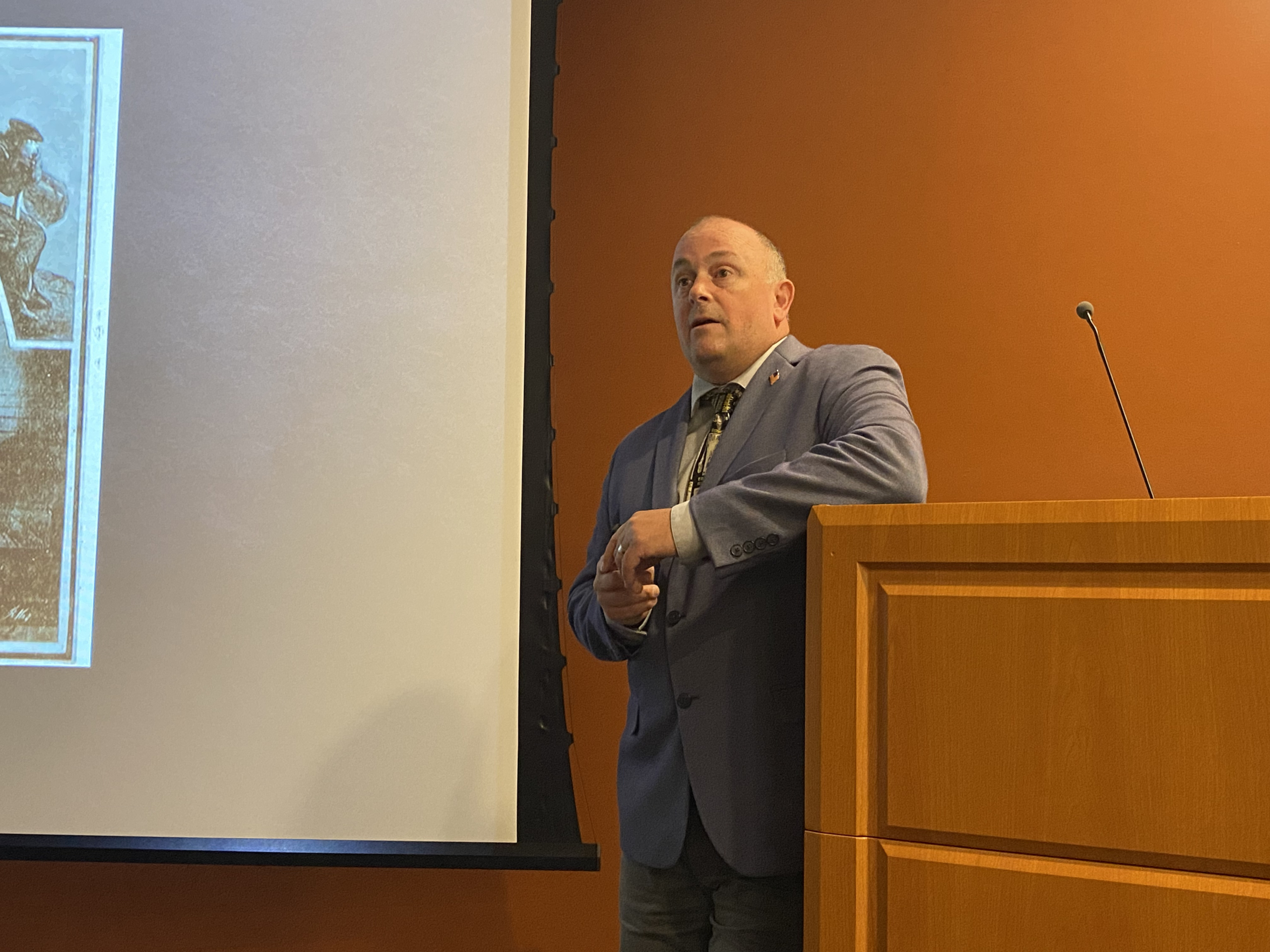He began by addressing major historical events that took place over the years in April, from the Battle of Lexington and Concord to the sinking of the Titanic. He then transitioned to the Civil War and the Lincoln assassination plot.