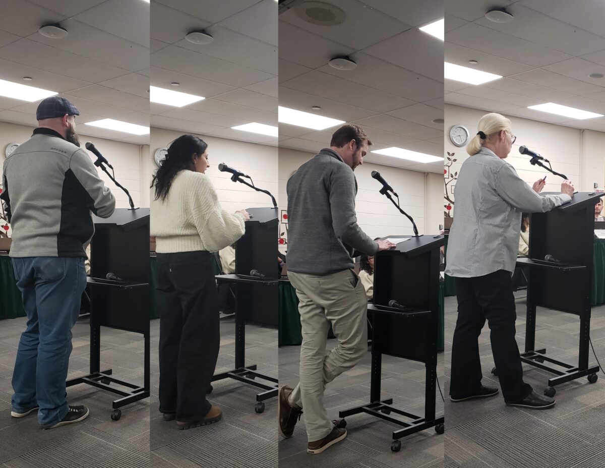 Woodcrest Elementary parents Jim Neary (left to right) Rebeca Sternbach, Jon Daly and Anne Einhorn addressed the board of ed on Feb. 24.