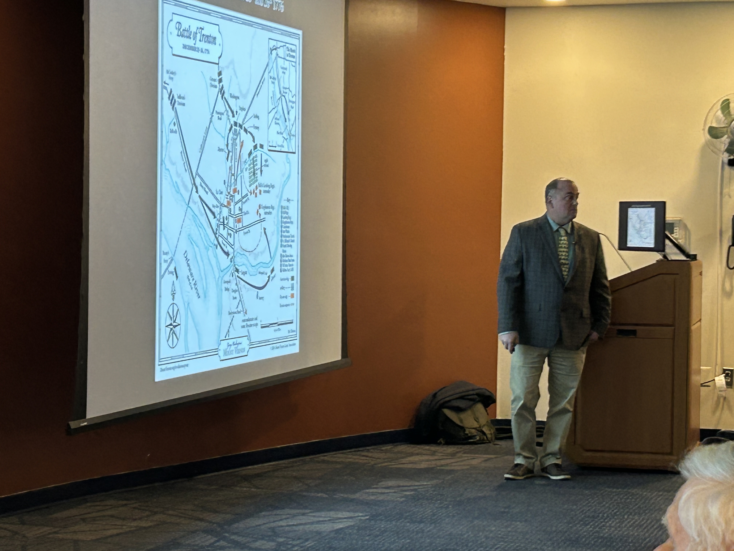 Michael Jesberger displays a map illustrating the Battle of Trenton during his presentation on Washington’s Crossing.