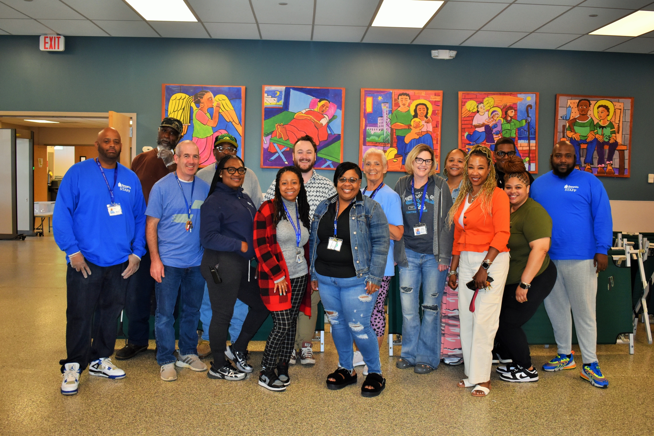 Taking a break at Joseph’s House of Camden on May 20 were Executive Director Colandra Coleman (fourth from right) and her staff. Paintings by Brother Mickey McGrath, an oblate of St. Francis De Sales, were in the background.